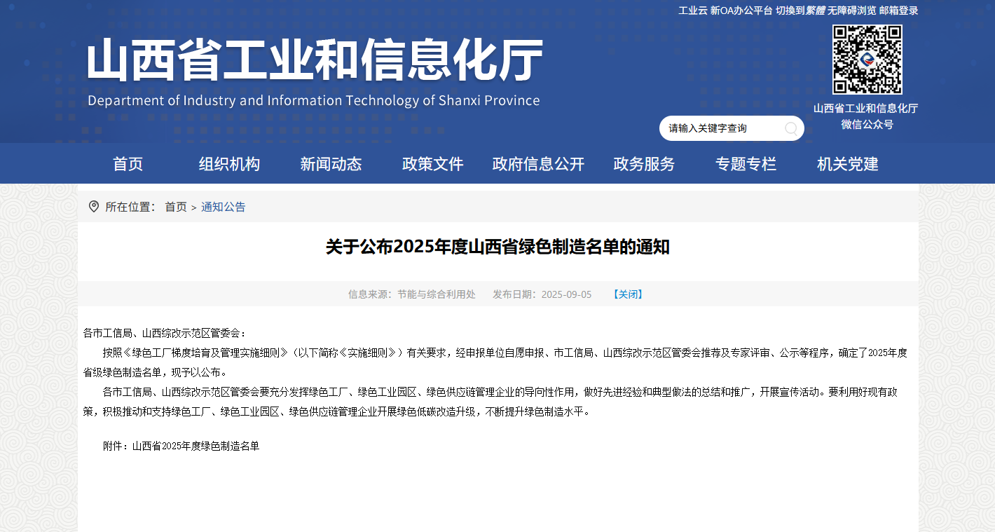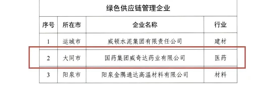近日,山西省工業和信息化廳公布山西省2025年度綠色制造名單,子公司國藥威奇達成功上榜,成為山西省“綠色供應鏈管理企業”。